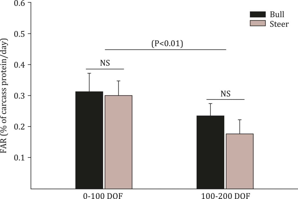 The objective of this study was to evaluate the effect of castration and days of feed (DOF) on glucose sensitivity and muscle expression of genes related to glucose metabolism, muscle growth, and fat deposition. Thirty-six Nellore bull calves were either surgically castrated or left intact, then harvested at 0, 100, or 200 DOF. Glucose tolerance tests were performed at 100 and 200 DOF. Longissimus dorsi (LD) samples were taken just after stunning for gene expression. Data were analyzed as a complete randomized design following a two (sexual condition) × three (DOF) factorial arrangement of treatments. An interaction effect was found for carcass fat gain (P = 0.01), showing that steers gained more fat than bulls from 100 to 200 DOF, but both sexual classes had a similar fat gain from 0 to 100 DOF. Basal blood glucose and the area under the curve post-infusion were not affected by castration or DOF (P>0.05). Castration tended (P = 0.08) to upregulate LD expression of Acetyl-CoA carboxylase alpha (ACACA). Interaction effects (P<0.05) were found for LD expression of IGF-1 receptor (IGF1R) and F-box protein 32 (FBXO32) with steers having greater relative abundance for both genes at 100 DOF, while bulls had greater relative abundance at 200 DOF. Despite the greater carcass fattening enhancement by castration and longer DOF, whole-body sensitivity to glucose does not change.