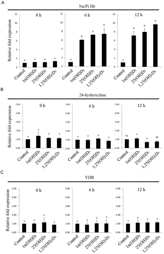 The purpose of this study was to investigate the effects of vitamin D3 metabolites 1α-hydroxycholecalciferol (1α(OH)D3), 25-hydroxycholecalciferol (25(OH)2D3), and 1,25-dihydroxycholecalciferol (1,25(OH)2D3) on growth performance, bone quality, and intestinal calcium homeostasis-related gene expression in broiler chickens. One-day-old broilers were fed a basal diet and basal diet containing different vitamin D3 metabolites. The body weight, feed intake, and feed conversion ratio in control and experimental broilers were measured to assess the growth performance, mineral levels, and bone breaking strength. The duodenum was used to assess calcium homeostasis-related gene expressions by quantitative reverse transcription-PCR. No statistically significant difference was found in growth performance, mineral deposition, or bone breaking strength in broiler chickens after three weeks feeding with vitamin D3. However, supplementation of vitamin D3 metabolites tended to improve feed conversion rate, bone mineral deposition, and breaking strength in broiler chickens. The results demonstrated that vitamin D3 metabolites significantly upregulated calcium homeostasis-related genes, including calbindin, β-glucuronidase, TRPV6, and Na/Pi IIb cotransporter, mRNA levels after 12 h of feeding. The vitamin D3 metabolite 1,25(OH)2D3 was the most effective at regulating calcium homeostasis-associated gene expression after 6 h of feeding. Dietary vitamin D3 metabolites may alleviate the development of TD in broiler chickens and these effects probably occur through regulation of intestinal calcium homeostasis-related gene expression.