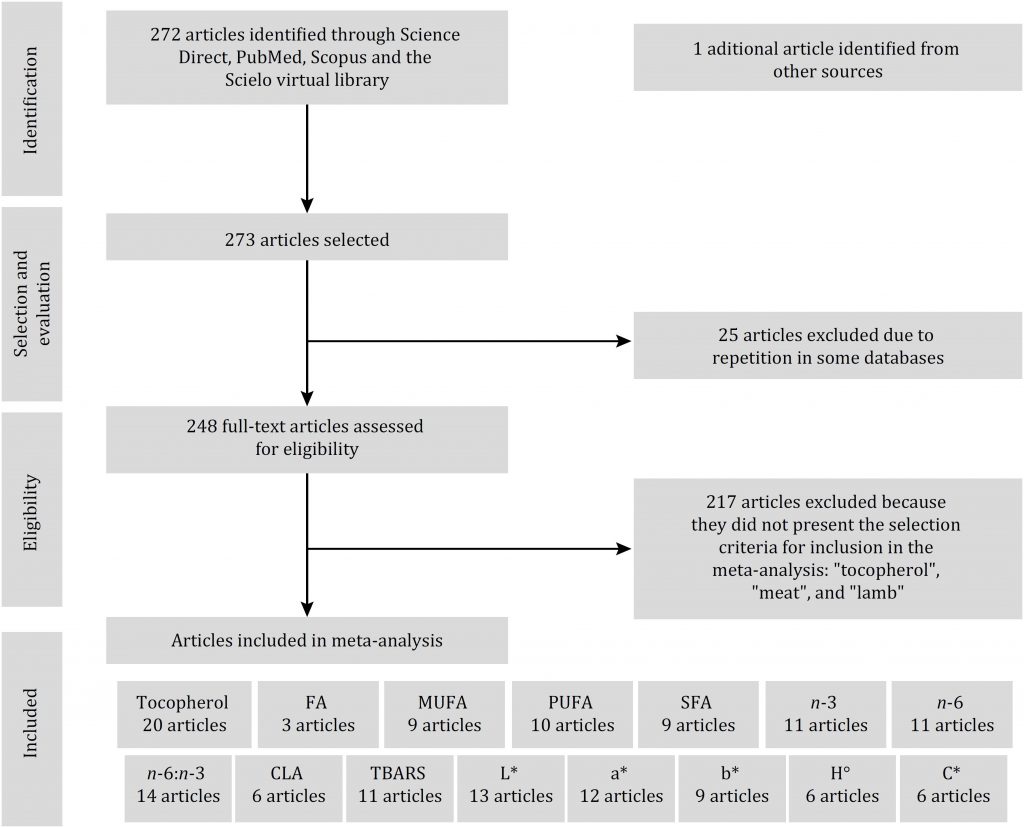 The objective of the present study was to evaluate, through a meta-analysis, the effects of feeding systems and tocopherol levels found in the diet of lambs on qualitative characteristics of their meat. A search of the computerised literature in Science Direct databases, PubMed, Scopus, and SciELO virtual library was carried out to select works that evaluated the quality of lamb meat. As a first requirement for inclusion in the meta-analysis, articles were selected with the keywords “tocopherol”, “meat”, and “lamb”. The variables extracted from the articles were classified according to the type of feeding system and tocopherol level in the diet of lambs. Production systems alter the qualitative characteristics of meat. Lambs raised exclusively on pasture present a higher tocopherol concentration in their meat, a lower omega 6:omega 3 ratio, a lower omega 6 concentration, and a higher conjugated linoleic acid concentration. Regardless of the dietary systems, when we classify the tocopherol levels of lamb diet, the tocopherol concentration and fatty acid level are altered by tocopherol levels in the diet. The lower tocopherol level in the diet results in meat with lower tocopherol concentration and with greater propensity to lipid oxidation.