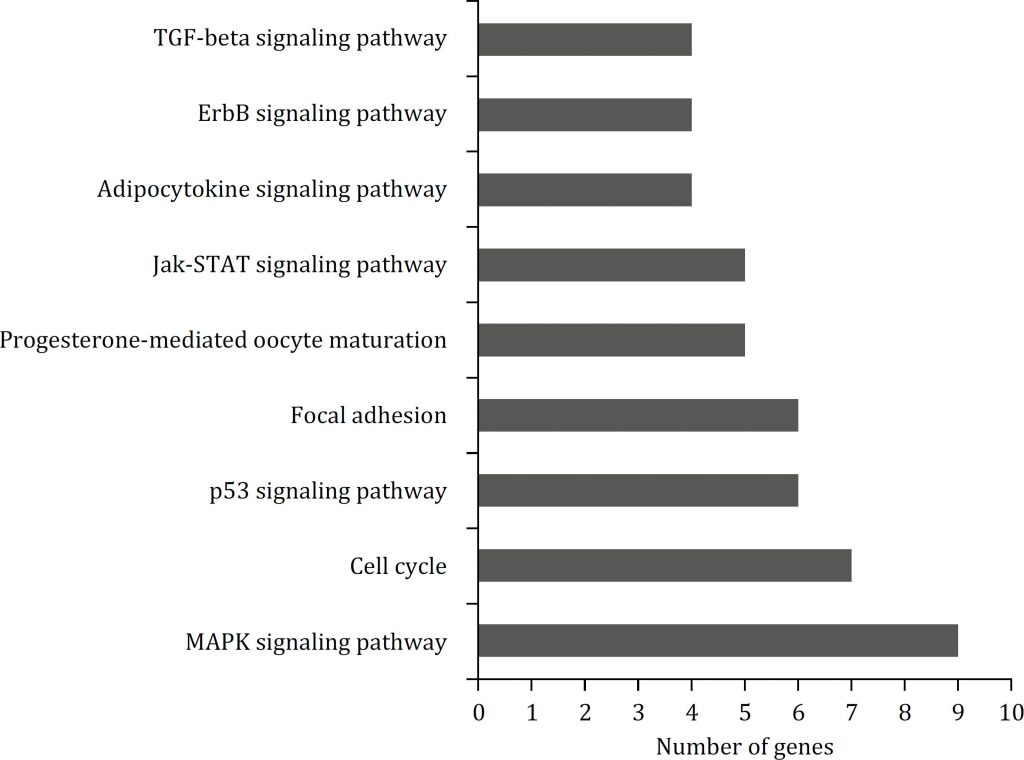 KEGG pathway enrichment analyses for the predicted targets of the differentially expressed miRNA in Meishan and Duroc M2 ovarian follicles.