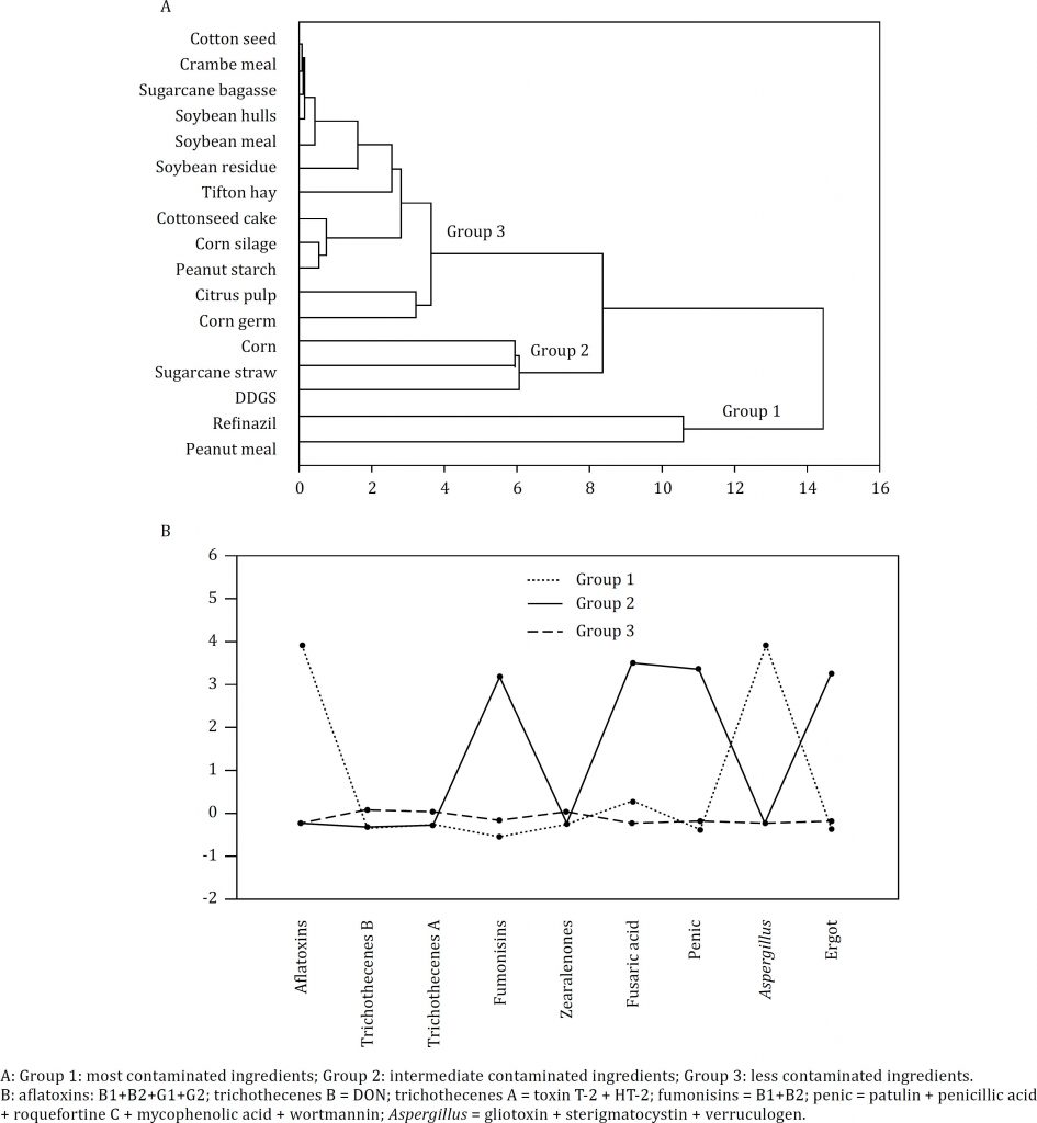 The objective of this survey was to identify what mycotoxins were present in ingredients used in diets offered to beef cattle in feedlots and their concentrations. The survey covered 30 Brazilian feedlots located in the five major beef-producing states. Samples of total mixed ration (TMR) and ingredients were collected and analyzed for mycotoxin using ultra-performance liquid chromatography coupled to tandem mass spectrometry. Mycotoxin concentrations were further interpreted according to known species-specific sensitivities and normalized according to the principles of toxic equivalent factors (risk equivalent quantities – REQ) expressed in µg kg−1 of aflatoxin B1-equivalent. Forty percent of the visited feedlots had apparent fungi in TMR. However, only one feedlot (3%) used a mycotoxin adsorbent. On the other hand, diets with high contamination presented no apparent fungi. One hundred percent of TMR was contaminated. All samples presented at least one mycotoxin contamination, with 65.5% considered low contamination, 27.6% medium contamination, and 6.90% high contamination. The toxins identified in TMR were fumonisins (most frequently), trichothecenes A, trichothecenes B, fusaric acid, aflatoxins, and ergot (mean concentration values: 2,330, 104.3, 79.5, 105, 10.5, and 5.5 µg kg−1, respectively). According to the contamination of TMR samples per region, Mato Grosso do Sul state presented the highest contaminations. Peanut meal was the most contaminated ingredient. One hundred percent of TMR in Brazilian feedlot is contaminated. Fumonisins were the mycotoxin most frequent and at highest concentrations in TMR samples. Moreover, mycotoxin concentrations have a distinct pattern among ingredients, TMR, and feedlots (local).