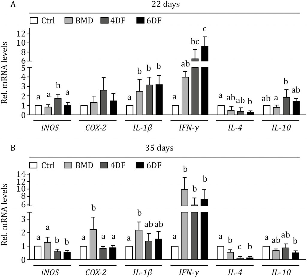 In the present study, we examined the growth parameters of Bacillus licheniformis in solid-state fermentation (SSF) and evaluated the effects of Bacillus licheniformis-fermented products on Clostridium perfringens-challenged broilers. During four and six days of SSF, the highest viable biomass was observed at 5% glucose, 10% soybean meal, 3% yeast, and 50% initial moisture content. The Bacillus licheniformis SSF products were heat- and acid-resistant. Furthermore, the fermented products were able to inhibit the growth of Clostridium perfringens and Staphylococcus aureus in vitro. In feeding experiments, in a similar manner to the antibiotic treatment group, dietary supplementation of Bacillus licheniformis-fermented products significantly improved intestinal morphology and necrotic lesions under Clostridium perfringens challenge, accompanied by increased IFN-γ mRNA expression in the spleen and bursa of Fabricius. These results together suggest that Bacillus licheniformis-fermented products have potential for development as feed additives and use as possible substitutes for antibiotics to treat Clostridium perfringens in the poultry industry.