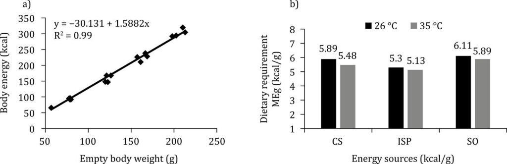 The objective of this study was to evaluate whether replacing corn starch (CS) energy with isolated soy protein (ISP) and soybean oil (SO) and the ambient temperature affect the protein and energy requirements for maintenance and gain of European quail. Thus, a total of 432 European quail from 10 to 30 days of age, distributed in a completely randomized design, were used to estimate the protein and energy requirements for maintenance through the comparative slaughter methodology. The treatments consisted of three diets formulated with the replacement of CS, corresponding to 15% of the metabolizable energy in the diet, with ISP and SO, two controlled temperatures (26 and 35 °C), and three levels of feed supply (ad libitum, and 70 and 40% of ad libitum intake), with four replicates of six birds. Protein and energy requirements for weight gain were determined from 160 European quail, slaughtered every five days at 10, 15, 20, 25, and 30 days of age. Birds were housed in four groups of 40 birds in a room with thermoneutral temperature (26 °C). The energy sources of the feed and temperatures studied affected protein and energy requirements for maintenance and gain of European quail. Replacing CS energy by 15% of dietary energy with SO results in lower protein and energy maintenance requirements for European quail at both temperatures. The protein and energy weight gain requirements of quail fed SO as an energy source is higher than CS and ISP.