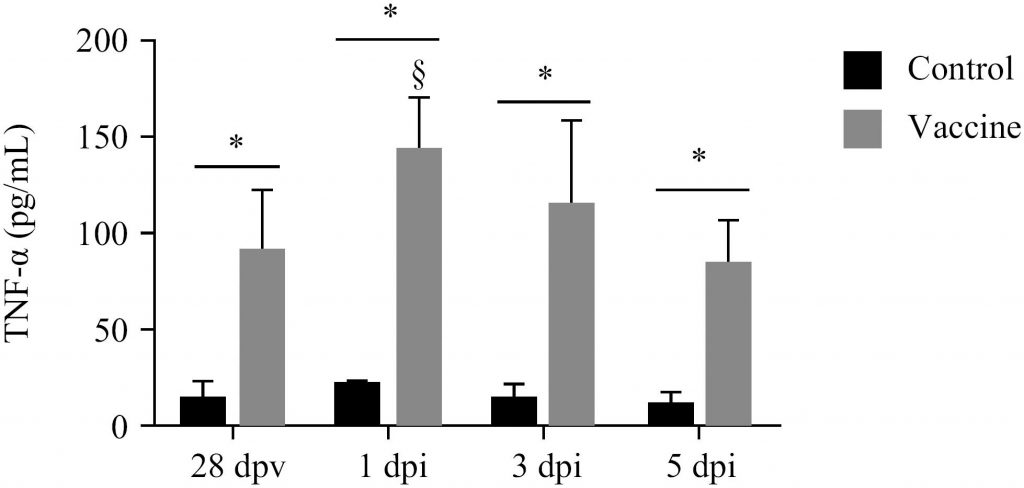 The present study aimed to investigate the kinetics of acute phase proteins and cytokines in the serum of immunized or naive pigs following infection with a field isolate of foot-and-mouth disease (FMD) virus. Five-month-old SPF pigs were intramuscularly immunized with or without the 146S antigen (7.5 μg per head) purified from FMD virus (O/Andong/SKR/2010) and were subsequently challenged 30 days post-vaccination (dpv) with FMD virus on each footpad. Serum samples were obtained at 28 dpv and on days 1, 3, and 5 post-infection (dpi). At 28 dpv, the serum concentrations of C-reactive protein and tumor necrosis factor alpha (TNF-α) were higher in the immunized pigs compared with the non-immunized control pigs. Upon challenge, the levels of all measured acute phase proteins (i.e., C-reactive protein, major acute phase protein, S-amyloid A, and haptoglobin) plateaued at 1 dpi in the immunized pigs whereas they gradually increased up to 5 dpi in the non-immunized control pigs. Levels of serum TNF-α remained higher in the immunized challenged pigs compared with the non-immunized challenged pigs. The serum concentration of interleukin (IL)-6 in the immunized challenged pigs was undetectable at all time points, but moderately increased upon challenge in the non-immunized challenged pigs. IL-1β was not detected in any of the pigs at any of the observed time points. Collectively, these findings show that the immunized pigs exhibit a rapid serum acute phase protein response following subsequent challenge with the field FMD virus compared with the non-immunized pigs.