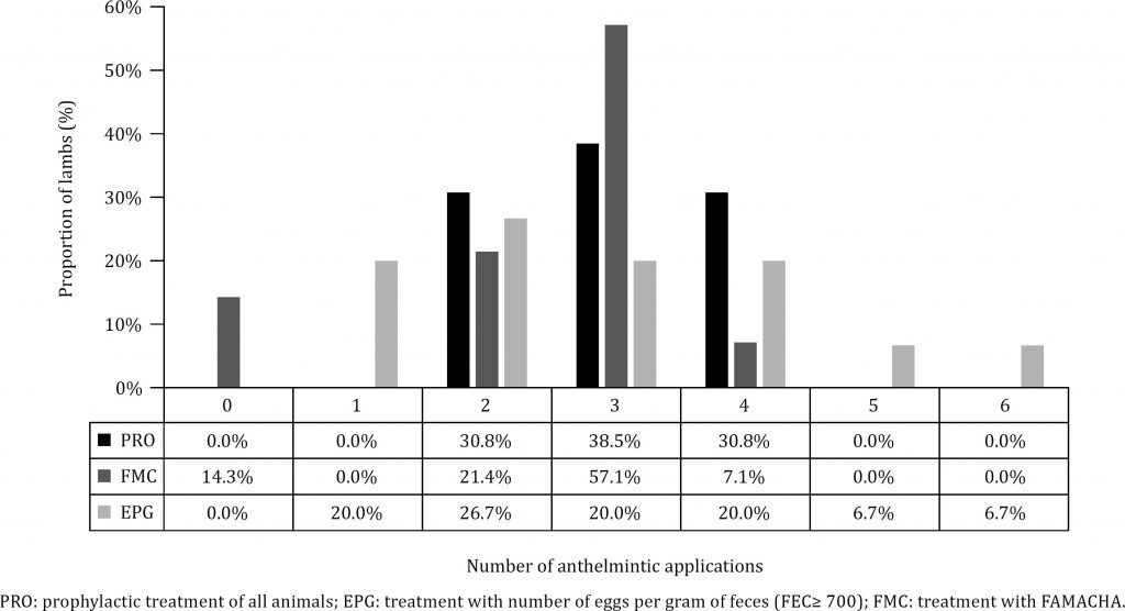 The objective of this study was to evaluate the productivity and carcass traits of unweaned Suffolk lambs finished on pasture and subjected to three strategies for endoparasite control: prophylactic treatment of all animals every 28 days; treatment of animals with a cut off number of nematode fecal egg count (FEC) ≥ 700; and treatment of animals using the FAMACHA scores ≥ 3. Average daily weight gain (ADG) and FEC were evaluated every 14 days for 112 days. Body condition scores and carcass characteristics were assessed before and after slaughter, respectively. Animal productivity was calculated based on animal stocking rate, ADG, and weight variation per area. Animal productivity, pasture, and carcass characteristics did not differ among strategies of parasite control. Parasite control strategies did not affect the productivity of lambs on pasture or carcass characteristics. Thus, the use of selective treatments can be considered advantageous due to decreased selection pressure for resistant parasite populations and lower use of drugs.