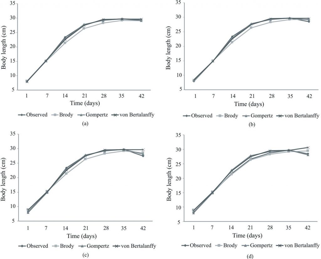 This study compared the growth curve models for the live weight and body length of Japanese quail raised under lights of various colors. The Brody, Gompertz, and von Bertalanffy growth models were used to investigate the effect of different colored lights on Japanese quail growth over a period of six weeks (1-42 days). Four lights of different colors, comprising yellow, red, blue, and white, were used in the study. According to the different light colors, the mean and standard error for the live weight and body length on day 42 were calculated as 196.09 and 3.87 g and 29.48 and 0.192 cm, respectively. Furthermore, while the differences in live weight according to the color of the light being used were statistically significant on days 14, 21, and 28, there were significant differences in body length on days 7, 28, 35, and 42, depending on the color of the light used. The highest values of R2 for body length and live weight were 0.9935 and 0.9988; the lowest sum of square error values for body length and live weight were 9.6588 and 10.6623 according to the Gompertz model. Test results did not reveal autocorrelation among serial data except for those grown under red colored lights.