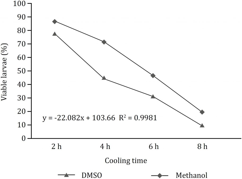 This study aimed to evaluate the effect of using different concentrations (5, 7.5, 10, and 12.5%) of two permeating cryoprotectants, dimethyl sulphoxide (DMSO) and methanol, on Prochilodus lineatus embryos while being subjected to cooling for 2, 4, 6, and 8 h at 4 °C. We analyzed the hatching rate, viable larvae, and counts of hatched and spoiled eggs and those that did not complete their development after cooling. We observed a significant interaction among variables, permeable cryoprotectant concentration, and cooling time, having the increase of these factors caused a reduction in hatching rate. The curimba embryos showed a higher sensitivity to cold at a temperature of 4 °C for 6 and 8 h, directly influencing the production of viable larvae. We did not observe a significant difference in the variables analyzed when comparing the cryoprotectant solutions containing DMSO, methanol, and solutions containing only water and sucrose (0.5M). An increase in the concentration of cryoprotectant and cooling time promotes a reduction in the hatching rate and in the percentage of viable curimba larvae.