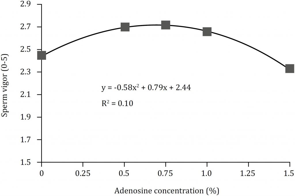 This study analyzed the adenosine concentration on quality of ram semen in different refrigerated storage times at 5 °C. The design was in blocks with repeated-measures factorial design. Five levels of adenosine and four refrigeration times were considered as fixed effects and the animal as random effect (block). Ram semen was diluted with Andromed® diluent (control) and increasing adenosine levels (0.5, 0.75, 1, and 1.5%). The samples were taken from refrigeration after 4, 8, 12, and 16 h and evaluated for progressive rectilinear sperm motility, sperm vigor, and membrane integrity (supravital test). Data were subjected to analysis of variance with Tukey’s test. The regression analysis was conducted to evaluate behavior of adenosine levels. Factor interaction for rectilinear progressive motile variable was verified. There was a quadratic effect of progressive rectilinear motility in function of adenosine levels for each cooled storage time studied, with recommended maximum adenosine concentration of 0.81 and 1.04% at 4 and 8 h, respectively. Adenosine also promoted a protective effect on the membrane integrity. Adenosine added to the diluent increases sperm motility and vigor and protects the sperm membrane integrity.