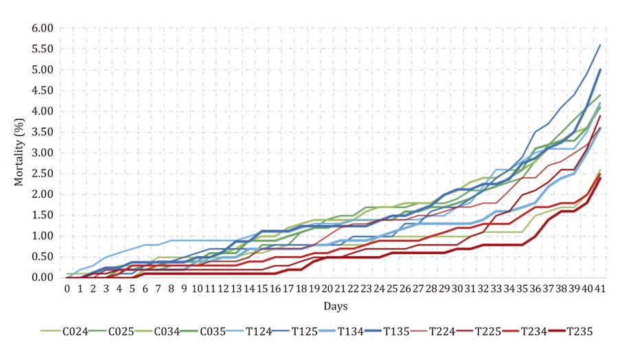 In this study, we investigated the effects of using poultry offal meal (POM) produced in rendering plants by adding dissolved air flotation sludge (DAFS) at set ratios into broiler grower and finisher feeds. The experiment conducted within the scope of the study lasted six weeks and involved 12,000 broiler chicks from Ross 308 strain middle-aged (36 weeks) breeders. Twelve different treatments were used in grower feed with 2 or 3% POM and finisher and pre-slaughter feeds with 4 or 5% POM produced by adding DAFS at 0, 11, and 22%, respectively. A downward trend was observed in average live weight (ALW), daily weight gain (DWG), feed conversion ratio (FCR), and European production efficiency factor (EPEF) values among the treatment groups, some of which were significant (P<0.05), as the usage rates of POM and DAFS increased. The treatment groups fed POM without DAFS in 2% grower and 5% finisher feeds had significantly higher ALW and EPEF values and significantly lower FCR values than the group fed POM at 22.0% in 3% grower and 5% finisher feeds (P<0.05). However, the mortality value remained unchanged according to the POM and DAFS usage rates (P>0.05). As a result, POM may be used in broiler feeds without significantly affecting ALW, DWG, FC, FCR, EPEF, and mortality values. However, if DAFS is used in POM production, attention should be paid to DAFS content, since exceeding certain levels may cause a downgrade in ALW, FCR, and EPEF values.