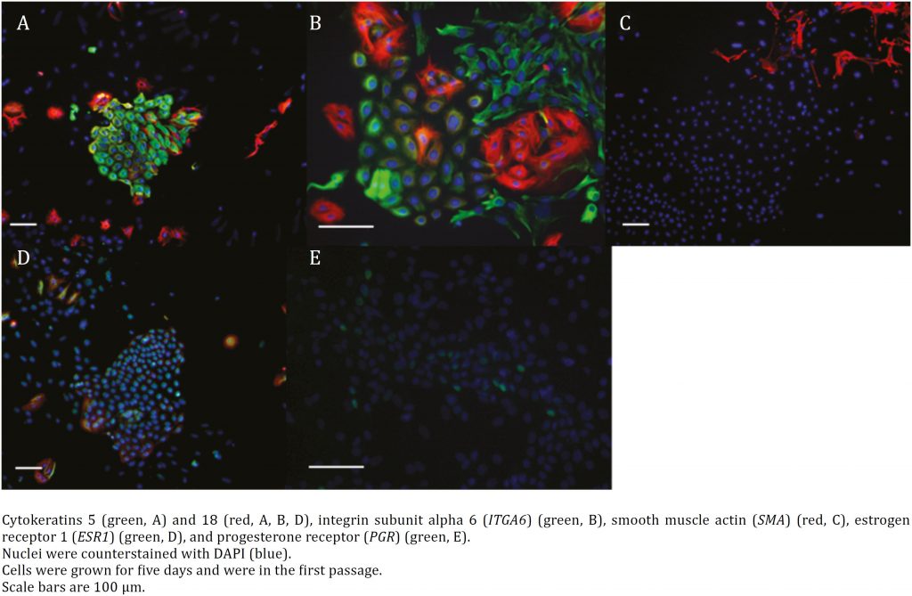 A selection of commercially available antibodies, targeted against markers employed in studies of mammary gland biology, was tested to determine their reactivity in goat mammary tissue and the derived tissue cultures. Expression of the markers smooth muscle actin ( SMA ), selected keratins ( KRT ) 5, 14, 18 , and 19 , CD24 molecule ( CD24 ), epithelial cell adhesion molecule ( EPCAM ), mucin 1 ( MUC1 ), integrin subunit alpha 6 ( ITGA6; CD49F ), integrin subunit beta 1 ( ITGB1; CD29 ), cyclin dependent kinase inhibitor 1A ( CDKN1A; p21 ), membrane metalloendopeptidase ( MME; CD10 ), progesterone receptor ( PGR ), estrogen receptor 1 ( ESR1 ), and vimentin ( VIM ) was first assessed on mRNA level, using reverse transcription PCR (RT-PCR). The reactivity of the antibodies in the tissue sections and the derived tissue cultures was determined using immunofluorescence. The result of this study is a list of commercially available antibodies, raised mostly against human antigens, which also recognize orthologous goat antigens and are useful for characterization of different mammary cell types. Additionally, primers that are functional in detecting expression of mammary lineage markers in goat mammary mRNA isolates were validated. The suggested antibodies, PCR primers, and the described methods are of practical value for researchers interested in characterization and isolation of cell types comprising mammary tissue of goats and probably other ruminants.