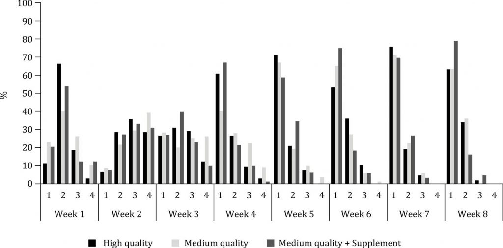 The objective of this study was to evaluate passive immunity transfer, health, performance, and metabolism of Holstein calves fed colostrum supplement associated with medium-quality colostrum. After birth, calves were blocked according to birth weight and date and distributed into the following treatments: high-quality colostrum (> 50 mg of Ig/mL; n = 15; 150 g kg−1 BW; positive control group); medium-quality colostrum (30-40 mg of Ig/mL; n = 14; 150 g kg−1 BW), and medium-quality colostrum (30-40 mg of Ig/mL; n = 15; 150 g kg−1 BW) + colostrum supplement (15 mL) given with the colostrum. Colostrum was given within the first 12 h of life in two meals by nipple bottle, and colostrum replacer was administered by a blister syringe. Blood samples were taken every 12 h up to 48 h of life for total serum protein (TSP) evaluation. After colostrum feeding, calves were fed 4 L of transition milking, split in two meals for a period of one to four days and received milk replacer thereafter. Calves were individually housed, with free access to water and concentrate and bucket-fed 6 L/d of milk replacer up to the sixth week of life, when they received 4 L/d until weaning, with eight weeks. Colostrum feeding protocol affected the TSP concentration in the first 48 h of life, while the concentrations of albumin, glucose, β-hydroxybutyrate, γ-glutamyl transferase, and alkaline phosphatase were not affected. During the milk-feeding period, the concentrate and total dry matter intake were not affected by the colostrum protocol, but increased as animals aged. Colostrum-feeding protocol did not affect performance or health of calves. Feeding colostrum supplement associated with medium-quality colostrum had no effect on passive immune transfer, performance, nor on the metabolism during the liquid-feeding phase.