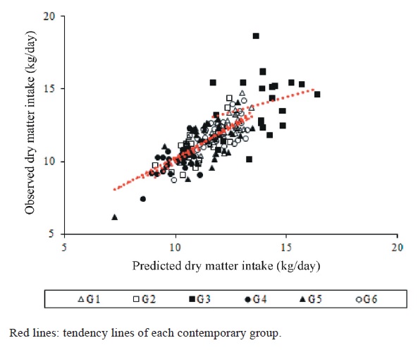 The objective of this study was to evaluate the associations between feed efficiency and feeding behavior, growth and carcass traits in Senepol cattle. A total of 137 animals were evaluated. Of these animals, 36 males were evaluated in a second test, totaling 173 records (initial age of 466±96 days and initial weight of 426±104 kg). Residual feed intake (RFI) was calculated as the difference between observed and expected dry matter intake, estimated by regression of dry matter intake on average daily gain and metabolic body weight (BW0.75), and the animals were classified as negative (high efficiency) and positive RFI (low efficiency). The mean RFI was -0.838±0.078 and 0.797±0.075 kg DM day-1 for negative and positive RFI animals, respectively, with a difference of 1.63 kg dry matter day-1. The dry matter intake of negative RFI animals, expressed as kg day-1 and percentage of mean body weight, was 11.3% and 13.1% lower than that of positive RFI animals. Negative RFI animals spent less time at the feed bunk and ingested less dry matter per visit than positive RFI animals, but did not differ in terms of chest girth, scrotal circumference, or hip height. However, negative RFI animals had lower rump fat deposition (7.13±0.477 mm) than positive RFI animals (7.83±0.473 mm). The Spearman correlation between RFI estimated in the first and second tests was 0.69, indicating that RFI is consistent when evaluated during two different periods of the life of the animal. Senepol animals with low residual feed intake (high efficiency) deposit less subcutaneous rump fat, but this reduction is not accompanied by a reduction in backfat thickness and longissimus muscle area.