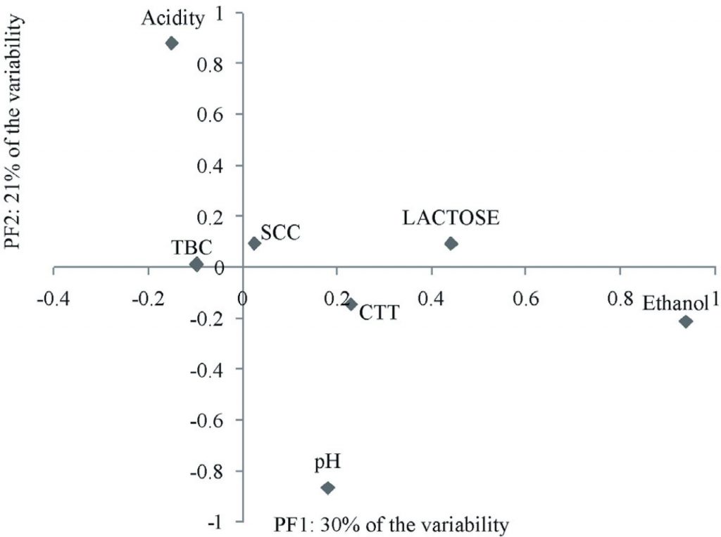 The objective of this research was to determine the variation of milk stability evaluated with ethanol, boiling, and coagulation time tests (CTT) to identify milk components related with stability and verify the correlation between the three methods. Bulk raw milk was collected monthly at 50 dairy farms from January 2007 to October 2009 and physicochemical attributes, somatic cell (SCC), and total bacterial counts (TBC) were determined. Milk samples were classified into low, medium, and high stability to ethanol test when coagulation occurred at 72 °GL, between 74 and 78 °GL, and above 78 °GL, respectively. Univariate analysis was performed considering the effects of year, months, and interaction in a completely randomized design. Principal factor analysis and logistic regression were done. There was an interaction between months and years for stability to the ethanol test and coagulation time. All samples were stable at the boiling test. Boiling test was not related to ethanol and coagulation time tests. Coagulation time was weakly but positively correlated with ethanol test. Broken line analysis revealed that milk stability measured with CTT and ethanol tests decreased sharply when SCC attained 790,000 or 106 cell/mL of milk, respectively. Milk stability measured with ethanol test decreased when TBC was higher than 250,000 cfu/mL, while there was no inflexion point between TBC and stability measured with CTT. Milk with high stability presented lower values for acidity, TBC, and SCC but higher values for pH, lactose, protein, and CTT compared with low-stability milk. Due to the execution easiness, single-point cut-off result and low cost, we do not recommend the replacement of ethanol test for boiling or coagulation time test.