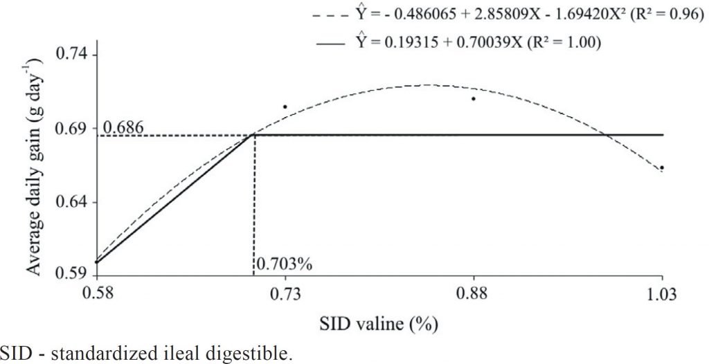 The objective of this study was to evaluate the standardized ileal digestible (SID) valine and SID leucine levels on performance, backfat thickness, longissimus dorsi depth, and biochemical blood parameters of starting gilts. A total of 72 gilts, with initial weight of 15.16±1.15 kg, were distributed in a randomized block design in a 2 × 4 factorial scheme, comprised of two SID leucine levels (1.20 and 1.77%) and four SID valine levels (0.58, 0.73, 0.88, and 1.03%), with nine replicates and one animal per experimental unit. No interactions were observed for growth performance parameters. Final weight and average daily gain presented linear and quadratic effects. Setting data to the quadratic model associated with the Linear Response Plateau model, the optimal level of SID valine for average daily gain was achieved at 0.703%. A quadratic effect was also observed for average daily feed intake (ADFI), estimating the highest ADFI at 0.822% of SID valine. No branched chain amino acid (BCAA) effects were observed for backfat thickness, longissimus dorsi depth, and lean meat percentage. The interaction between levels of BCAA showed that the highest SID leucine levels (1.77%) provided a high plasma urea concentration only at low SID valine levels (0.58 and 0.73%). The SID valine requirement of starting gilts for a maximum average daily gain is achieved at 0.703%, corresponding to 9.72 g day−1, and is not affected by SID leucine levels currently used in conventional diets.