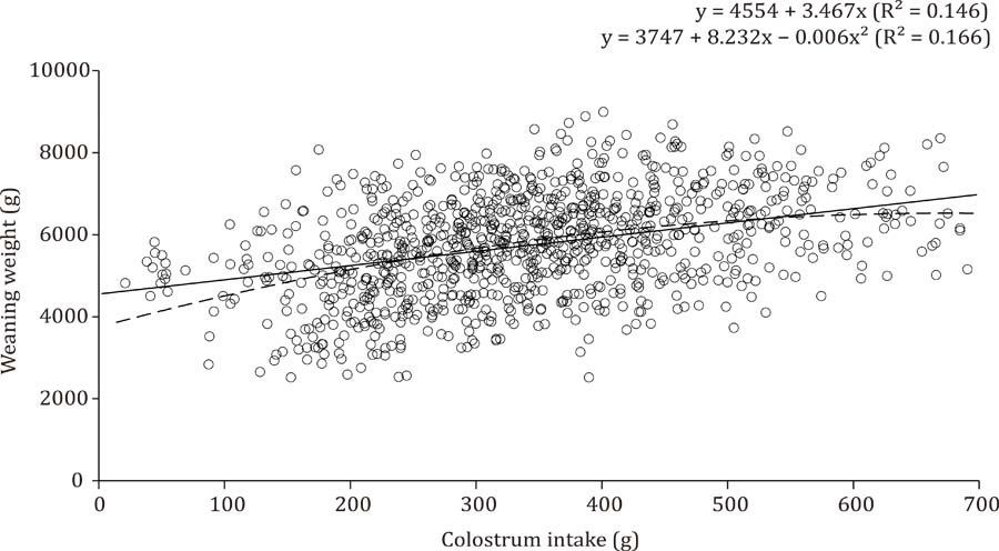 This study examined the effect of colostrum intake on pre-weaning mortality in piglets, focusing on neonatal vitality traits. Data from 2,050 piglets and 136 sows were collected from a commercial farm. Sows were monitored during gestation (parity, body condition, backfat thickness, weight gain, and gestation duration) and farrowing was monitored (duration, live births, mummified fetuses, stillbirths, maternal glucose, birth intervals, birth order, and sex). Neonatal traits (colostrum intake, meconium presence, umbilical rupture, rectal temperature, glucose, oxygenation, and heart rate) and performance measures (birth weight, weaning weight, and mortality) were recorded. Piglets that did not survive until weaning were born to sows with a longer farrowing duration (+26%; P<0.001), higher birth orders (+14%; P = 0.047), lower birth weights (−21%; P<0.001), reduced oxygenation (−1%; P = 0.019), lower rectal temperatures (−4%; P = 0.033), and significantly lower colostrum intake (−38%; P<0.001). Mortality was associated with rectal temperatures (<38.35 °C), colostrum intake (<172 g), birth weights (<897.5 g), and farrowing durations (>301 min), as identified by a tree-based model. Low colostrum intake correlated with longer farrowing durations (+7%; P = 0.044), longer birth intervals (+32%; P = 0.013), higher birth orders (+12%; P = 0.015), lower body weights (−5%; P = 0.005), reduced umbilical rupture rates (−11%; P = 0.049), lower rectal temperatures (−1%; P = 0.046), and lighter weaning weights (−10%; P<0.001). The model suggested that low colostrum intake was linked to birth weight (<990 g), sow body condition during gestation, and farrowing durations (>343 min). These results underscore the complex factors influencing colostrum intake and mortality, critical for sustainable swine production.